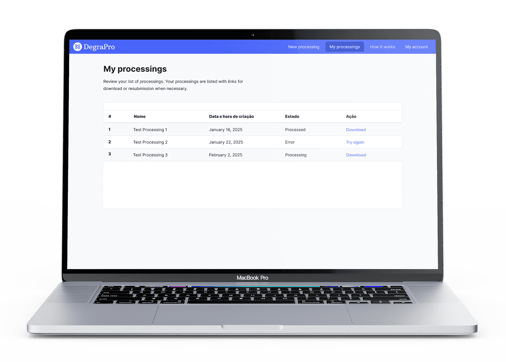 DegraPro is a web-based bioinformatics platform that centralizes and automates post-processing steps through a user-friendly graphical interface. The platform allows direct input of peptide sequences and retrieval of structural and functional results, with both web-based visualization and export to structured formats widely used by the scientific community.