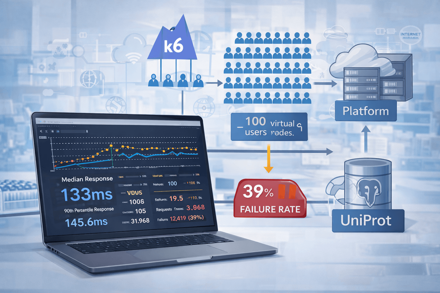 Load testing with k6 involved progressive load testing reaching 100 concurrent virtual users, generating 31,968 HTTP requests at an average rate of 19.5 requests per second. Results demonstrated excellent performance with a median response time of 133ms and 90th percentile of 145.6ms, well below the 2-second acceptance threshold. The platform architecture remains stable under high load, with response times staying low and predictable for accepted requests. The main bottleneck identified was external service (UniProt) rate limiting rather than platform architecture issues, with a 39% failure rate attributed to API rate limits. The architecture is suitable for exploratory and initial screening analyses, with a future scalability path identified through local database mirroring for high-throughput scenarios.