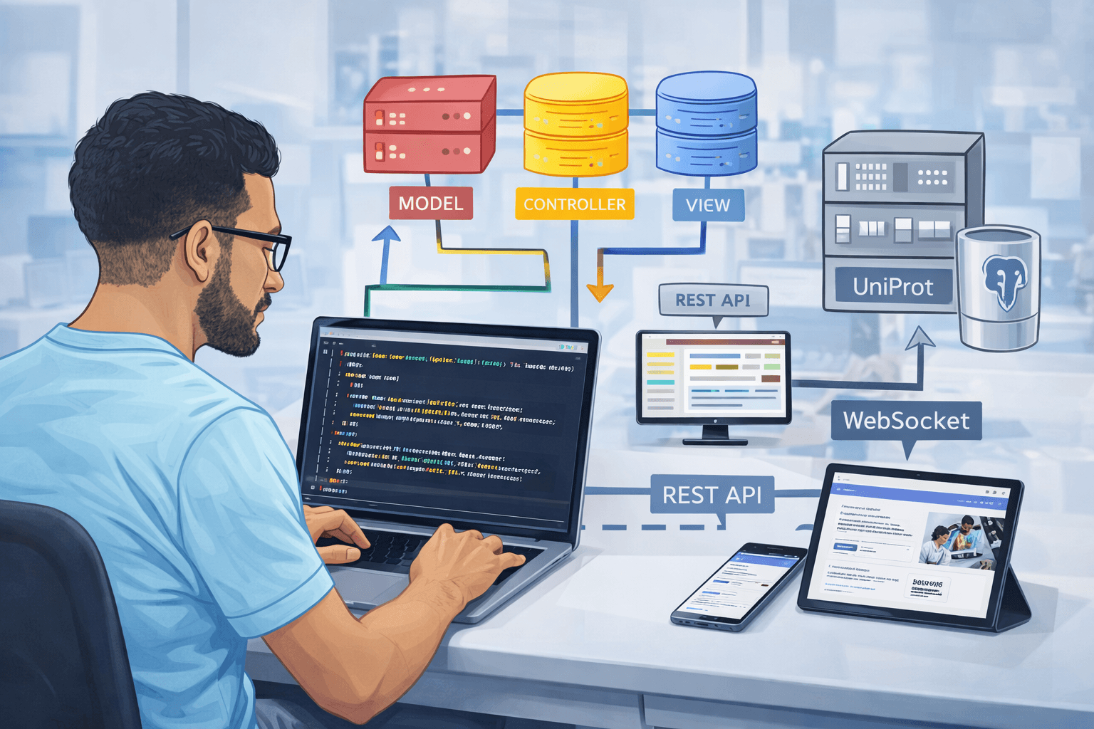 DegraPro was built using Ruby on Rails for rapid development through convention over configuration, maintainable code following DRY principles, and MVC architecture for clear separation of concerns. PostgreSQL was selected for its robustness, scalability for large data volumes, advanced concurrency control (MVCC), and transactional integrity essential for scientific data. The platform features MVC architecture with clear separation between data models, business logic, and presentation; RESTful API integration for seamless UniProt connectivity; WebSocket-based asynchronous processing for real-time updates on long-running tasks; relational database design ensuring data integrity; and responsive design supporting both desktop (71.4%) and mobile (28.6%) devices.